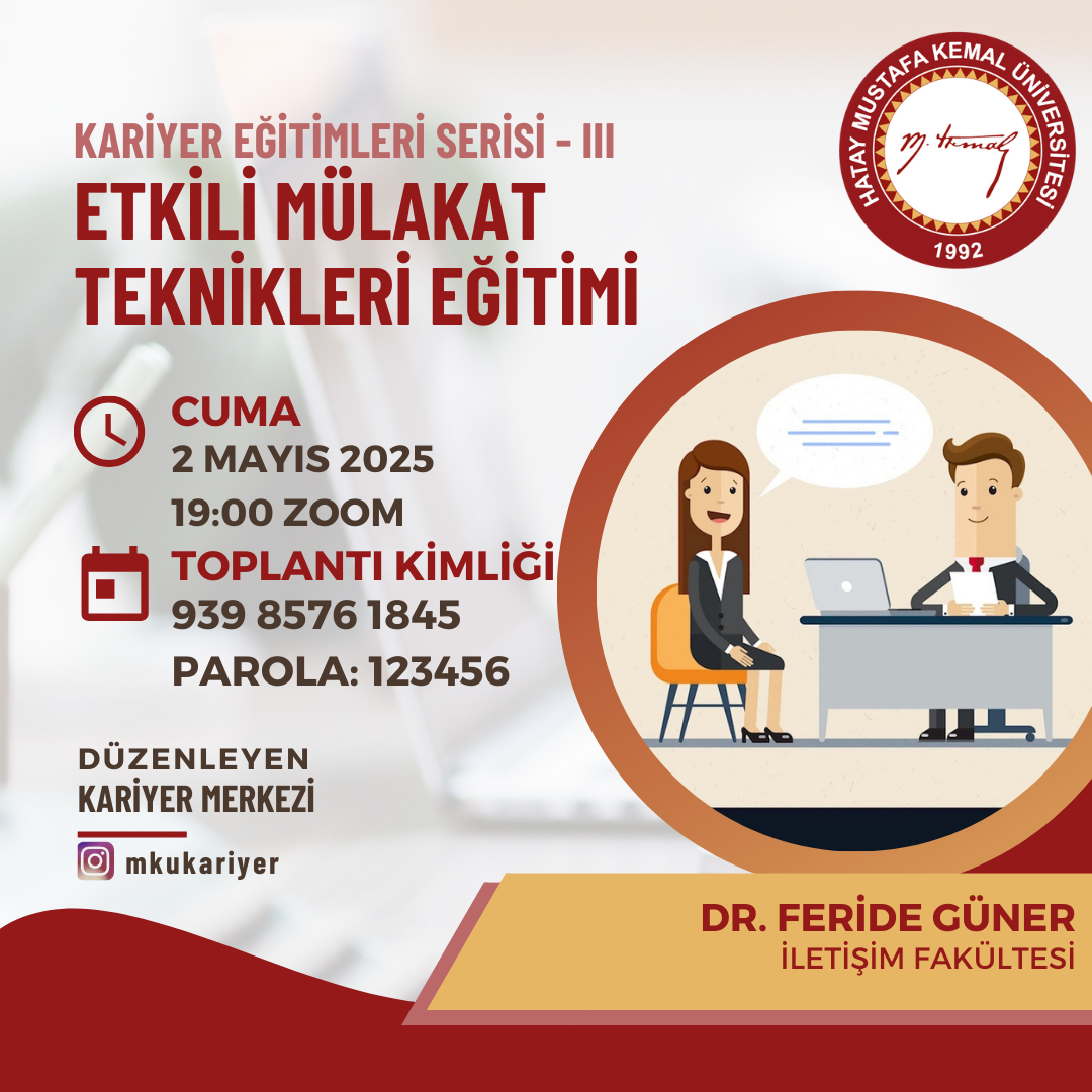 Kariyer Merkezimiz tarafından düzenlenen bu eğitimde, işe alım sürecinin en kritik aşaması olan mülakatlara dair kapsamlı bilgiler sizlerle paylaşılacak. Dr. Feride GÜNER'in rehberliğinde gerçekleşecek olan eğitimde pek çok başlık ele alınacaktır.
