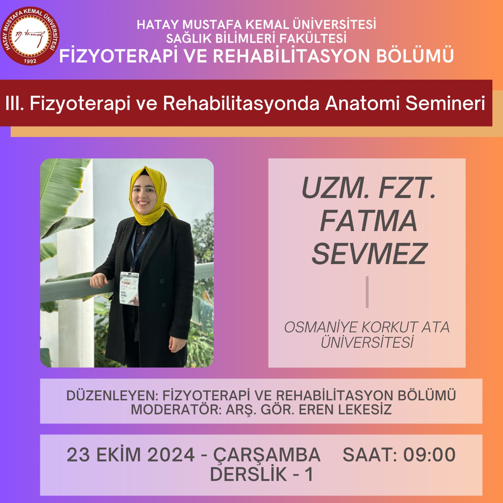 Hatay Mustafa Kemal Üniversitesi Sağlık Bilimleri Fakültesi Fizyoterapi ve Rehabilitasyon Bölümü tarafından düzenlenen "III. Fizyoterapi ve Rehabilitasyonda Anatomi" konulu seminerimiz mezunumuz Uzm. Fzt. Fatma Sevmez'in online katılımı ile, Arş. Gör. Eren Lekesiz'in moderatörlüğünde gerçekleştirilmiştir. Değerli hocamıza katılımları için teşekkür ediyoruz.