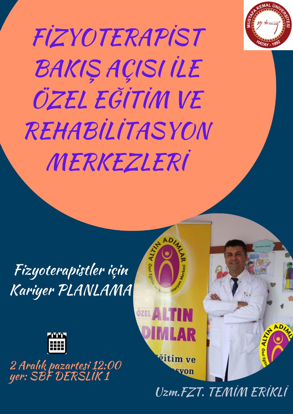 "Kariyer Planlama" dersi kapsamında  Uzm. Fzt. Temim ERİKLİ tarafından 02.12.2024 tarihinde saat:12.00'de "Fizyoterapist Bakış Açısı ile Özel Eğitim ve Rehabilitasyon Merkezleri" konulu söyleşi derslik 1 de gerçekleştirilecektir. Tüm öğrencilerimiz davetlidir.