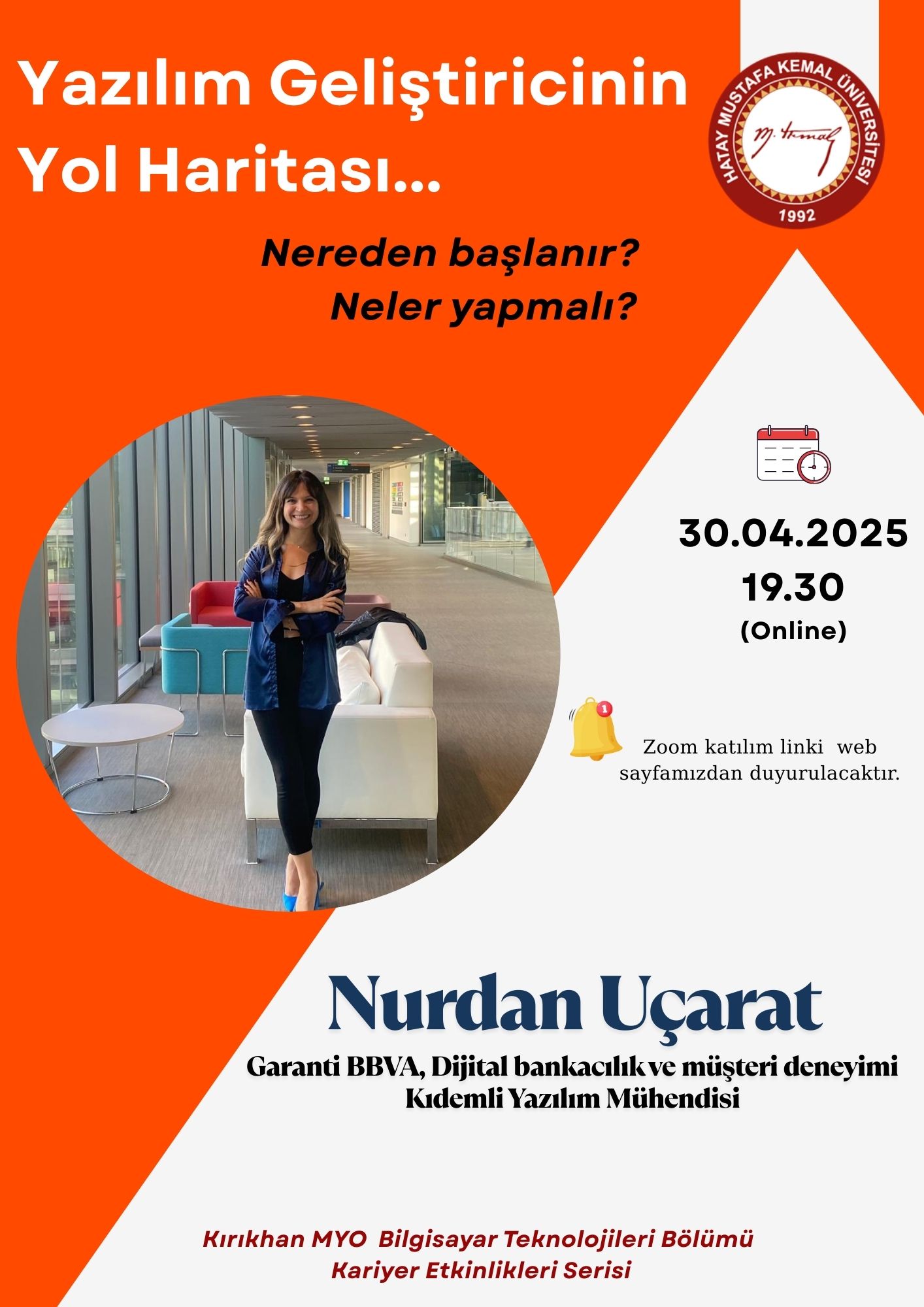 Kırıkhan Meslek Yüksekokulu Bilgisayar Teknolojileri Bölümü tarafından düzenlenen Kariyer Etkinlikleri Serisi kapsamında "Yazılım Geliştiricinin Yol Haritası", 30 Nisan 2025 tarihinde saat 19.30'da çevrim içi olarak gerçekleştirilecektir. Garanti BBVA Dijital Bankacılık ve Müşteri Deneyimi Kıdemli Yazılım Mühendisi Nurdan UÇARAT’ın konuk olacağı etkinlikte, yazılım geliştirme alanında kariyer hedefleyen öğrencilerimiz için yol gösterici bilgiler ve sektörel deneyimler paylaşılacaktır.