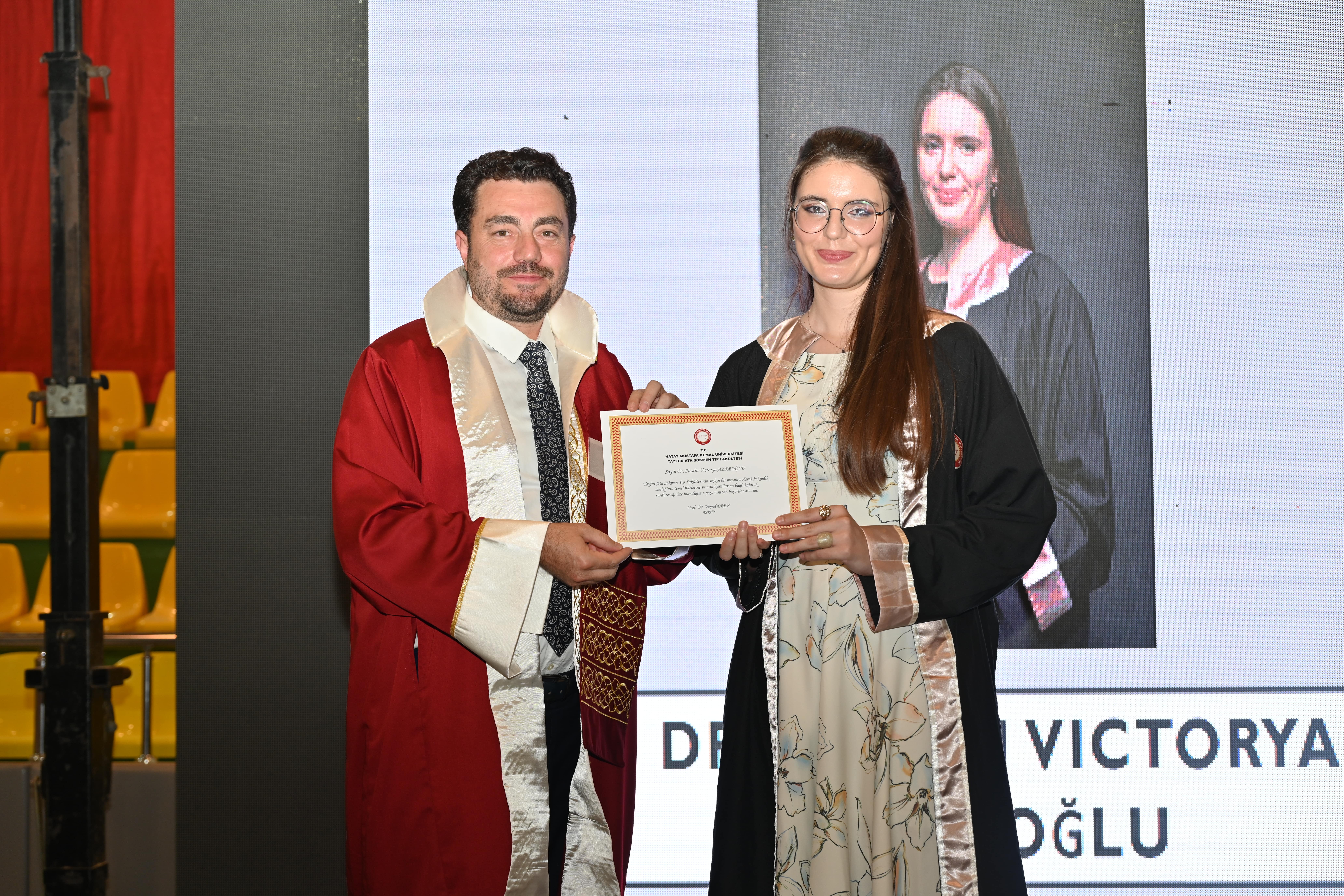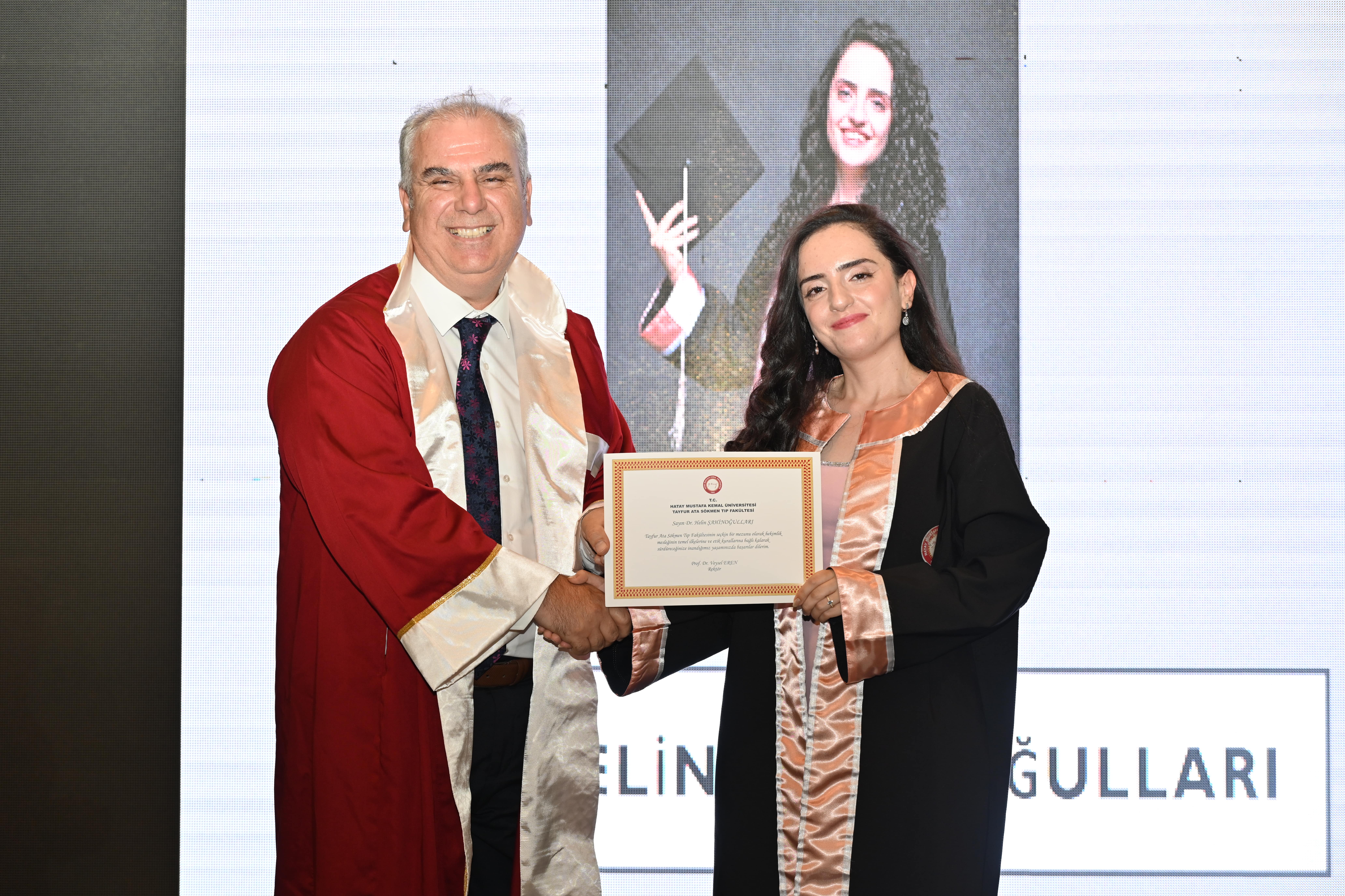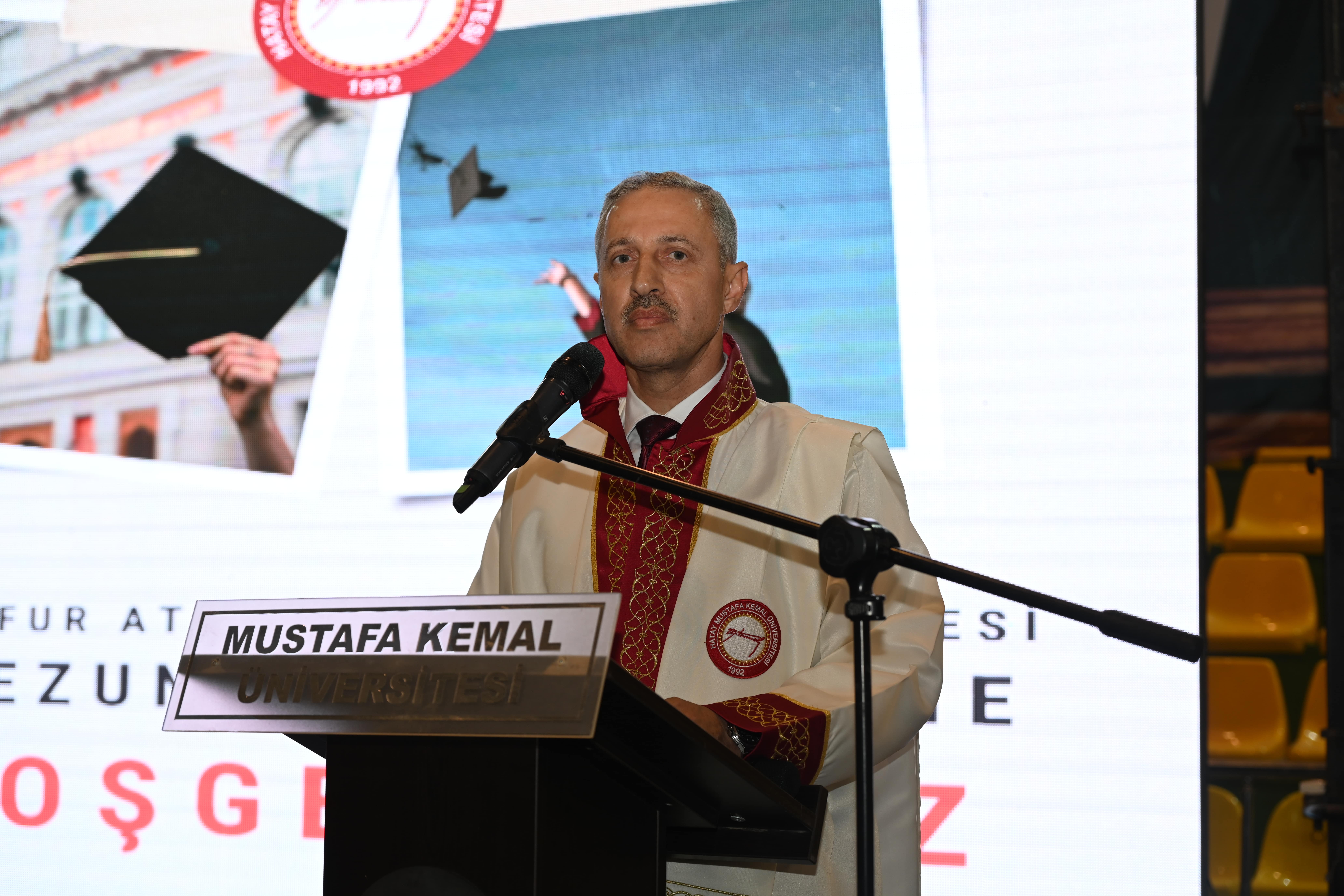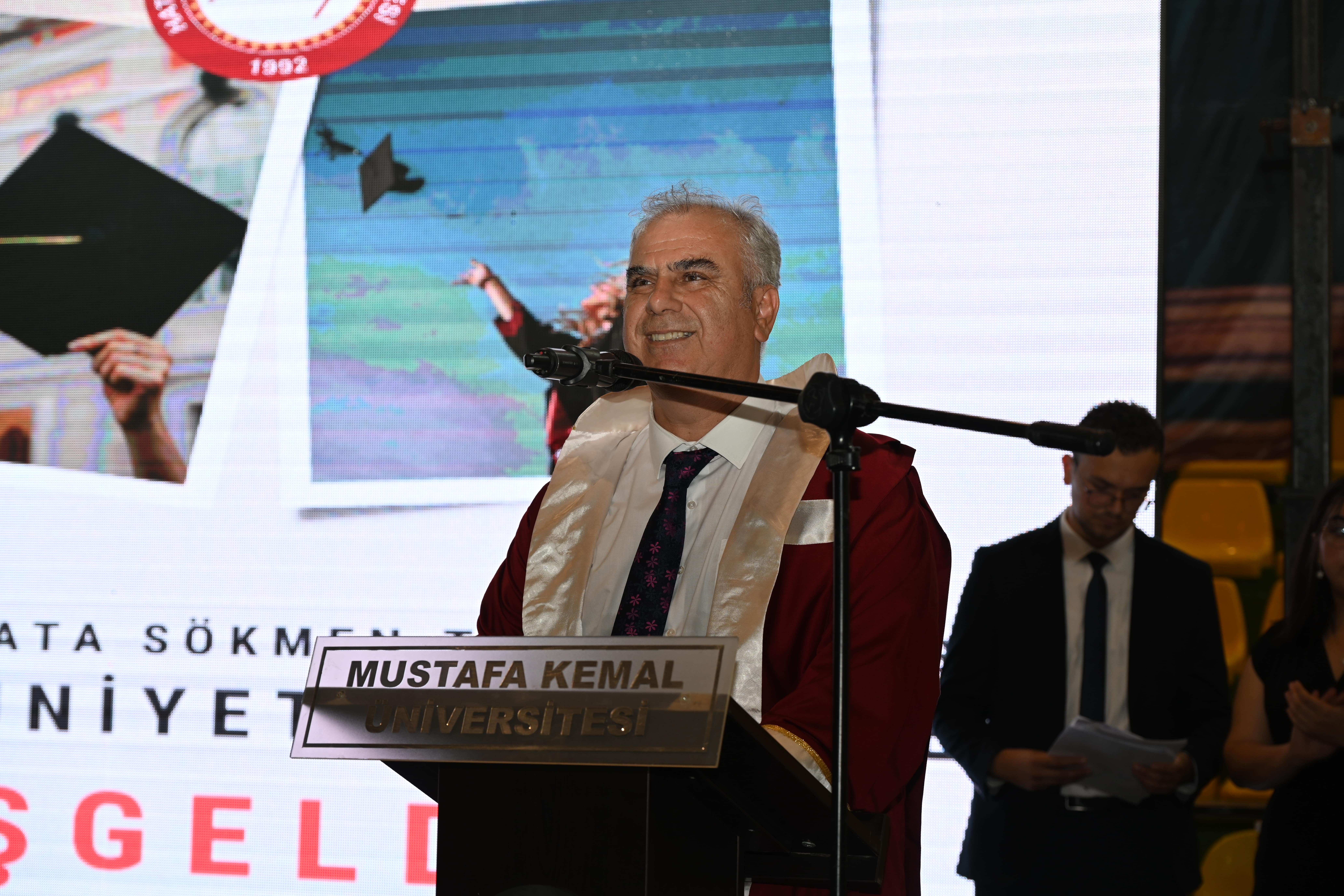Hatay Mustafa Kemal Üniversitesi Tayfur Ata Sökmen Tıp Fakültesi 2024-2025 eğitim öğretim yılını coşkulu bir mezuniyet töreniyle taçlandırdı. Tayfur Sökmen Kampüsü Kapalı Spor Salonunda düzenlenen törende konuşan Rektör Prof. Dr. Veysel Eren mezun hekimlere, “Sizler modern tıbbın bilge mimarlarısınız.” dedi.