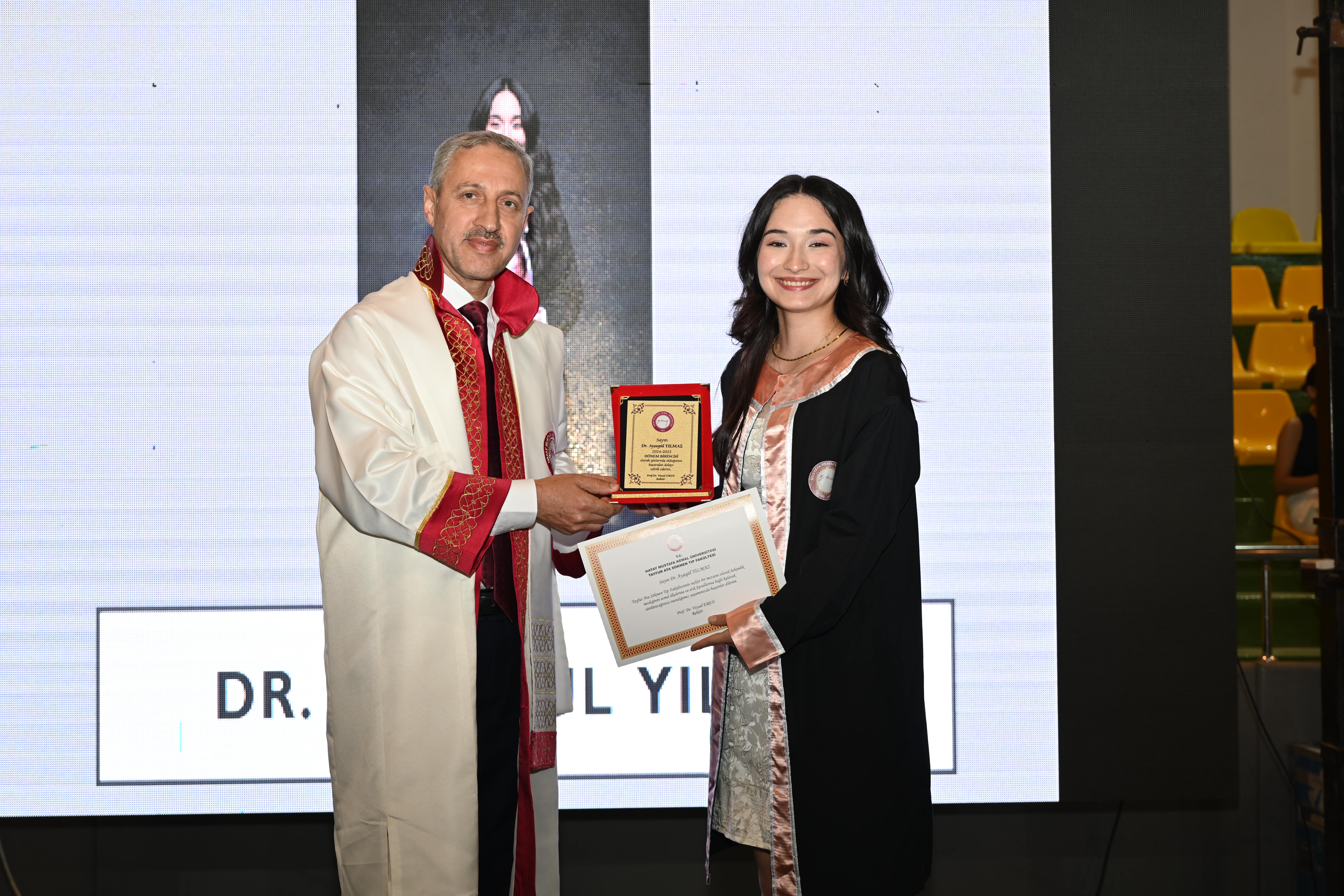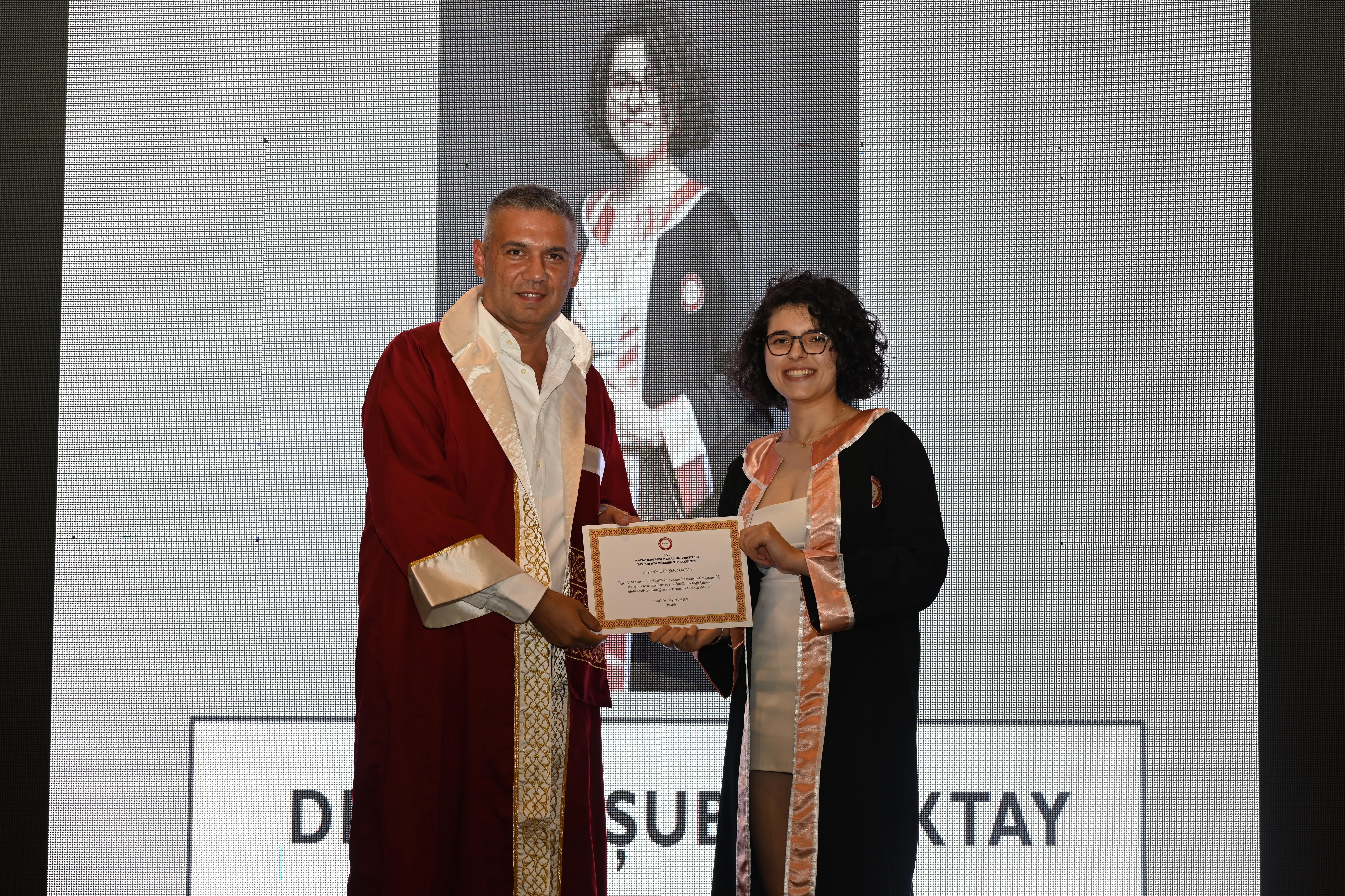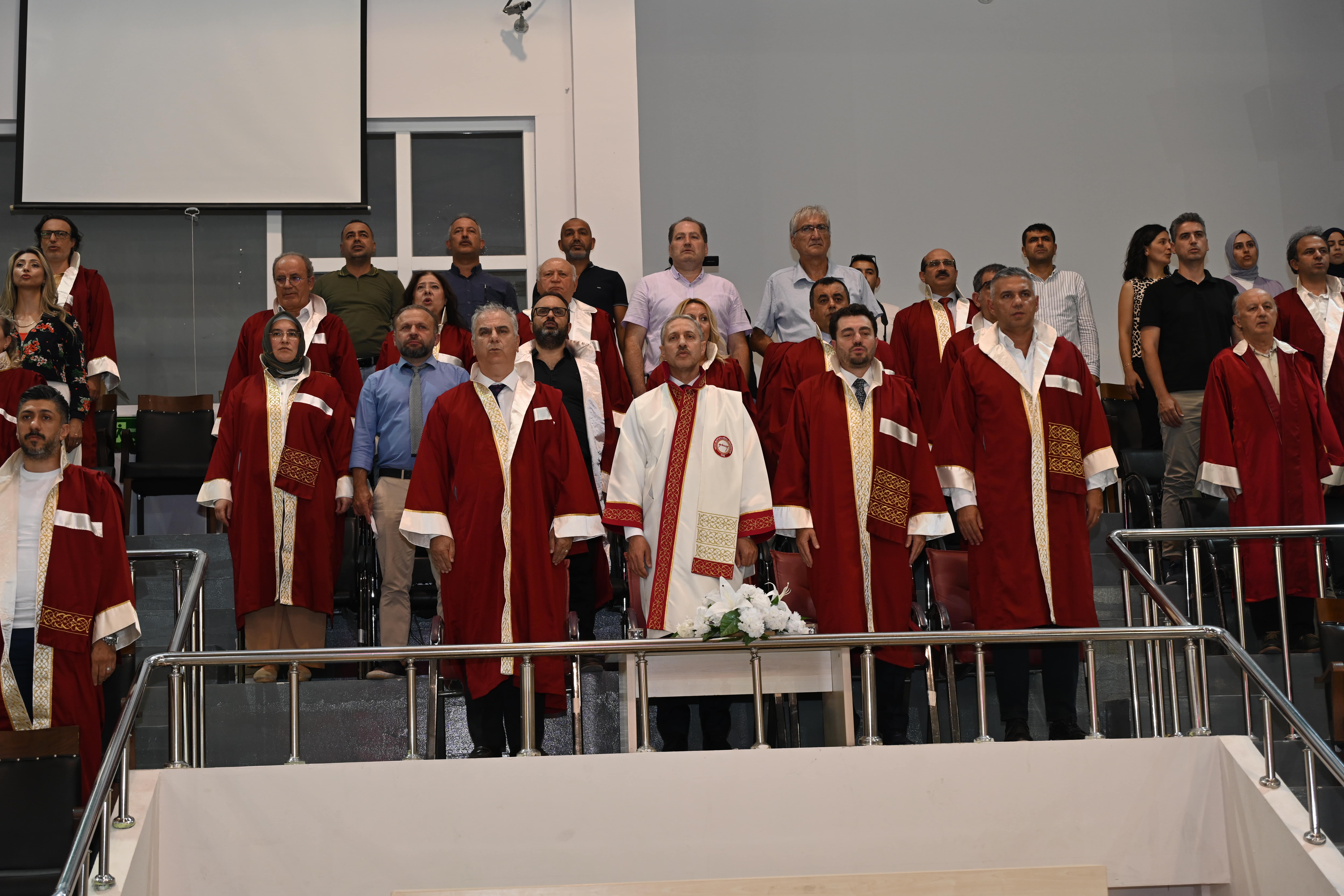 Programda 6 Şubat depremlerinde hayatını kaybedenlerin anısına video gösterimi yapıldı. Ardından mezun öğrencilerden oluşan kolaj gösterimi ile devam etti. Fakülte 1.’si Ayşegül Yılmaz mezuniyet kütüğüne levha çaktı. Ve dereceye girenlere diploma ve plaketleri takdim edildi. Zorlu bir eğitim-öğretim döneminin yorgunluğu, keplerin coşkuyla havaya atılmasıyla unutuldu. Mezuniyet sevinci, öğrencilerin, ailelerinin ve hocalarının yüzlerinde gurur ve mutluluk olarak yankı buldu.