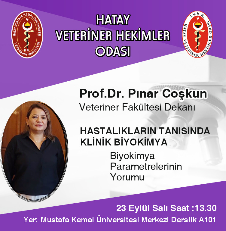 Hatay Veteriner Hekimler Odası ile işbirliği çerçevesinde Fakültemiz Dekanı ve Biyokimya Anabilim Dalı Öğretim Üyesi Prof. Dr. Pınar COŞKUN, meslektaşlarımıza yönelik olarak hayvan hastalıklarının tanısında önemli bir yer tutan "Hastalıkların Tanısında Klinik Biyokimya, Biyokimya Parametrelerinin Yorumu" adlı sunum yapacaktır. Bu eğitim, özellikle klinik uygulamalarda karşılaşılan vakaların tanısının konulmasına ve biyokimya sonuçlarının daha doğru yorumlanmasına katkı sağlayacaktır. Konuya ilgi duyan tüm hocalarımıza duyurulur.