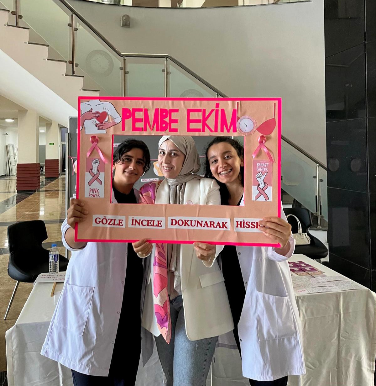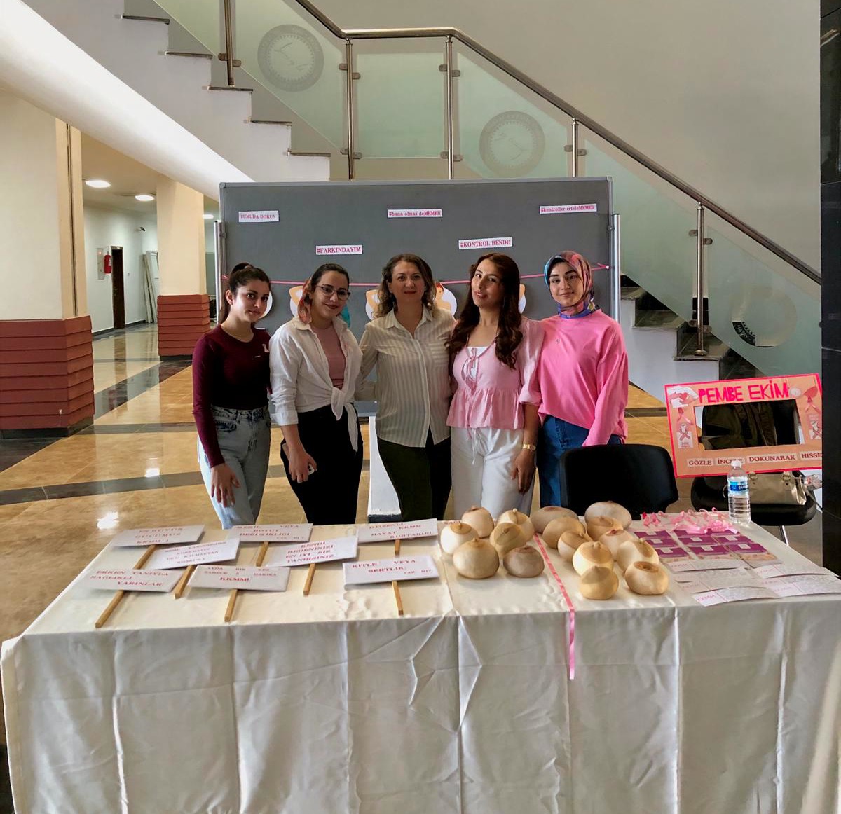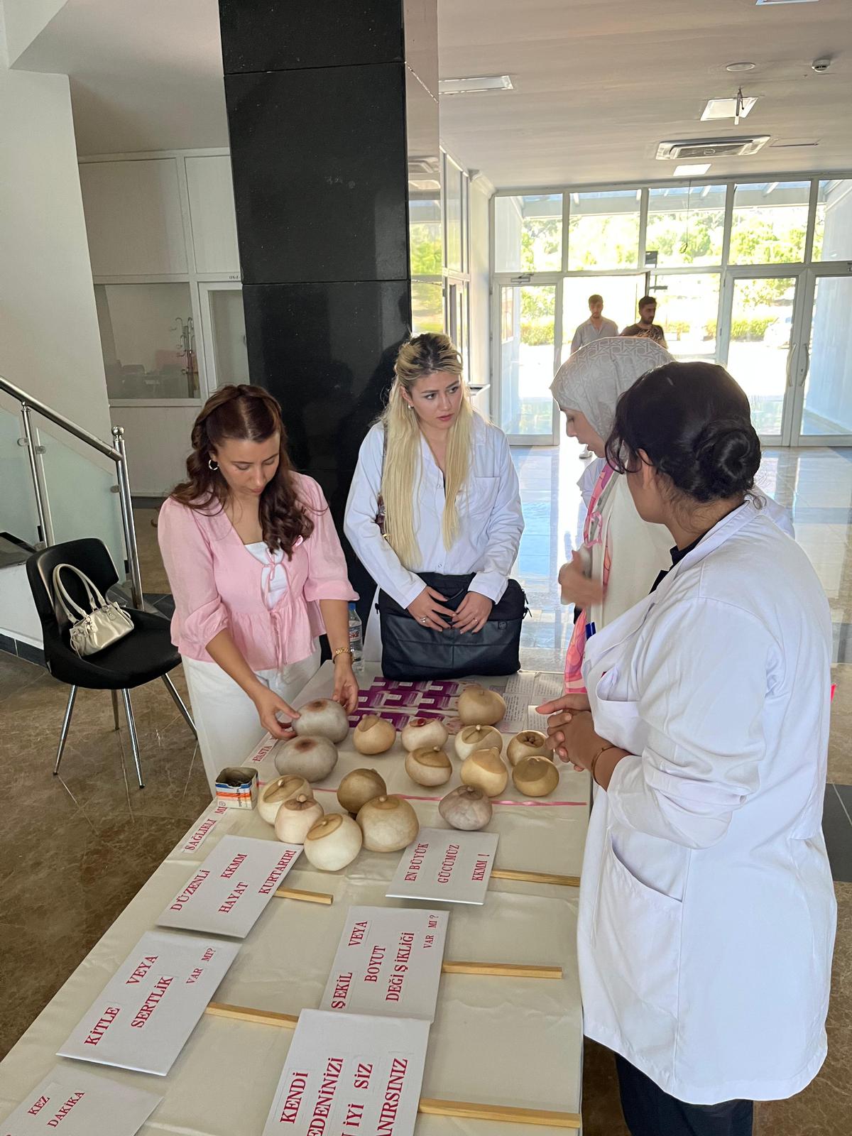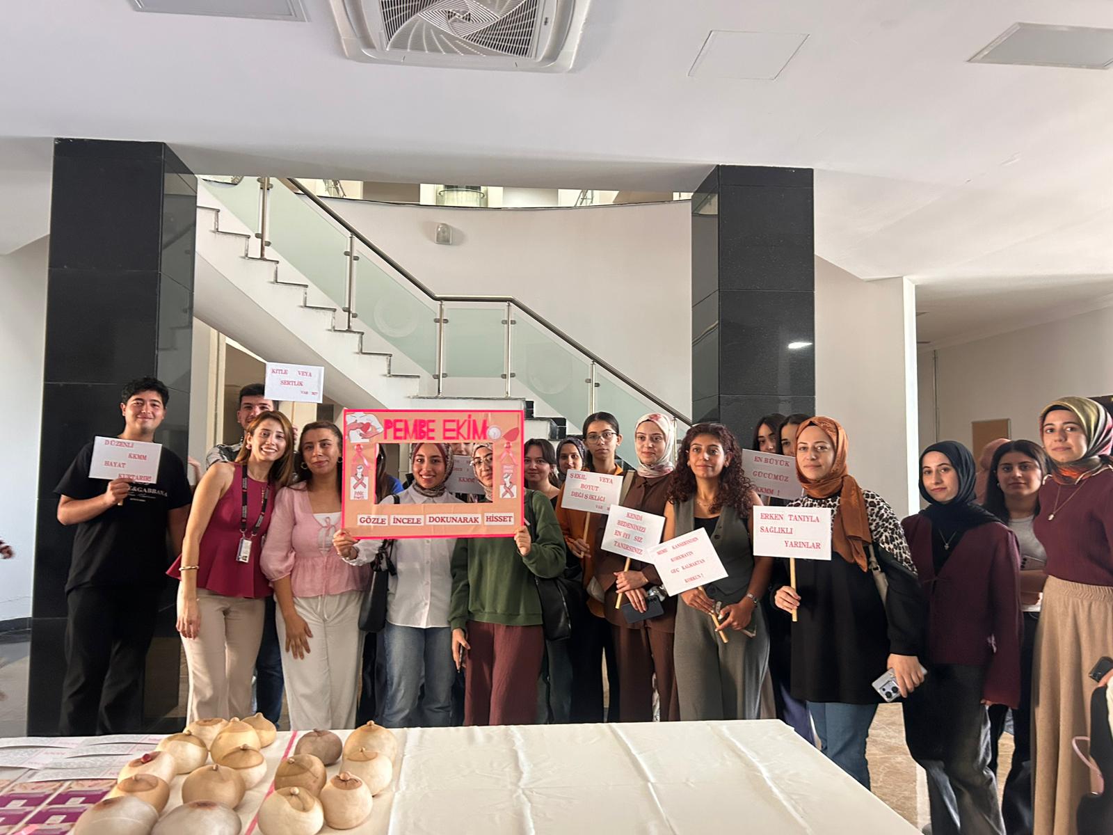 KAGÜN (Kadın Güçlendirme ve Üniversite Dayanışma Topluluğu) kapsamında, 1–31 Ekim Meme Kanseri Farkındalık Ayı etkinlikleri çerçevesinde, üniversiteli kadınlara yönelik farkındalık etkinliği düzenlenmiştir. Sağlık Bilimleri Fakültesi fuaye alanında gerçekleştirilen etkinlikte, kendi kendine meme muayenesi (KKMM) ve meme kanseri hakkında bilgilendirme eğitimleri verilmiş; sağlıklı ve hastalıklı meme maketleri, görseller ve bilgilendirici broşürler kullanılarak farkındalık oluşturulması amaçlanmıştır. Etkinlik süresince yaklaşık 100 kişi ile birebir iletişim kurulmuş ve 80 katılımcıya ulaşılmıştır.