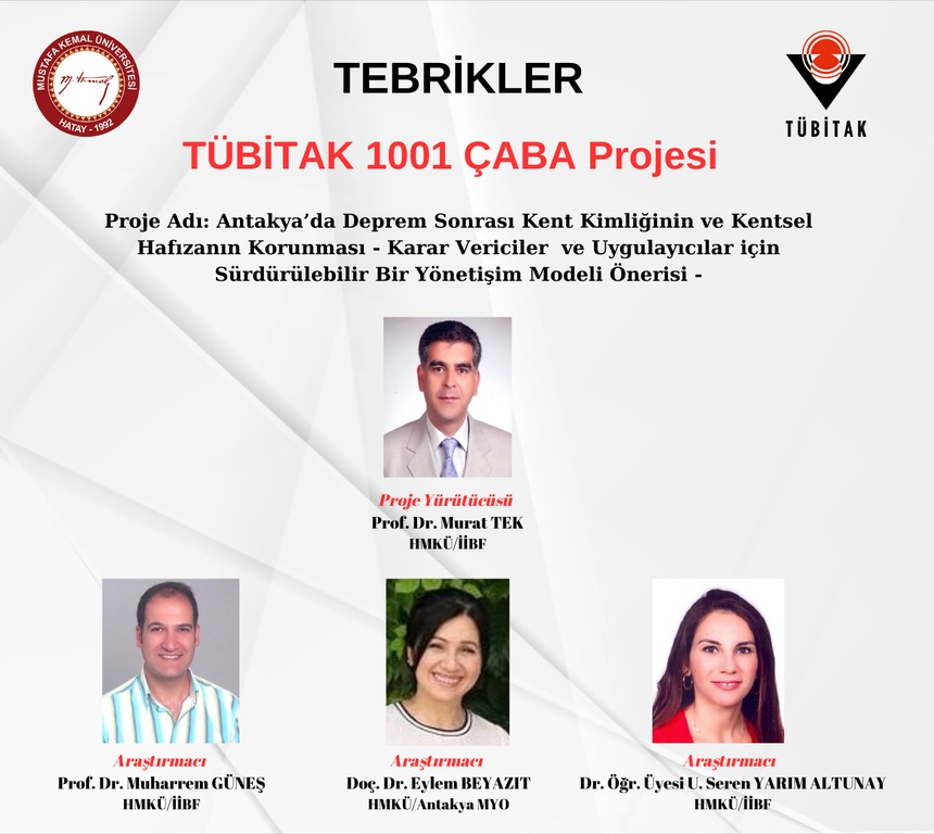 "Antakya'da Deprem Sonrası Kent Kimliği ve Kentsel Hafızanın Korunması - Karar Vericiler ve Uygulayıcılar İçin Sürdürülebilir Bir Yönetişim Modeli Önerisi" başlıklı proje Şubat depremlerinin ardından yeniden inşa sürecinde olan Antakya kentinin geleceği, kimliği ve hafızasının korunması açısından büyük önem taşıyor. Bu projede emeği geçen hocalarımızı tebrik ederiz.