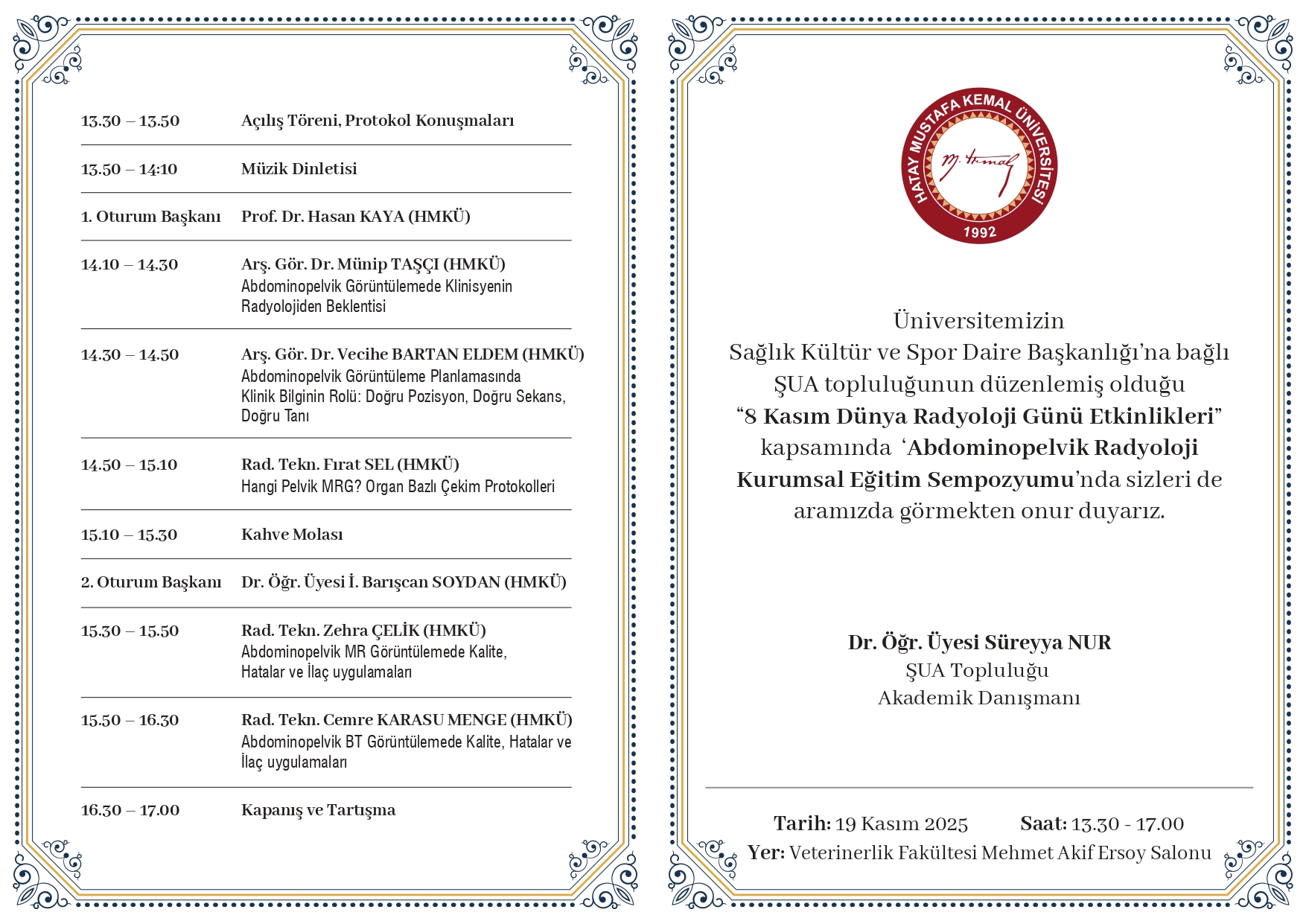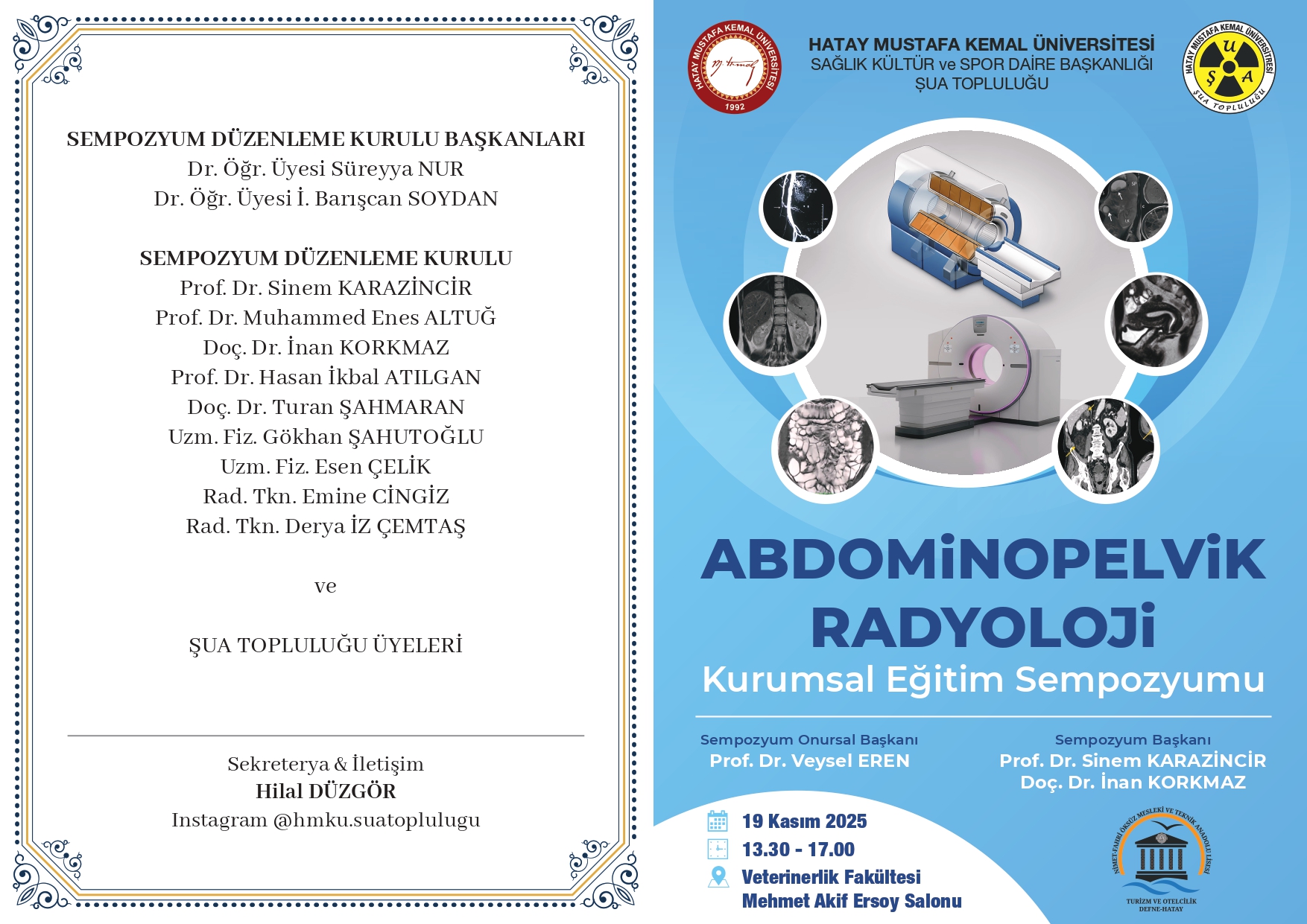 Hatay Mustafa Kemal Üniversitesi Sağlık Kültür ve Spor Daire Başkanlığı’na bağlı ŞUA Topluluğu tarafından, “8 Kasım Dünya Radyoloji Günü Etkinlikleri” kapsamında düzenlenen Abdominopelvik Radyoloji Kurumsal Eğitim Sempozyumu’na tüm akademik personel, öğrenciler ve sağlık profesyonelleri davetlidir.